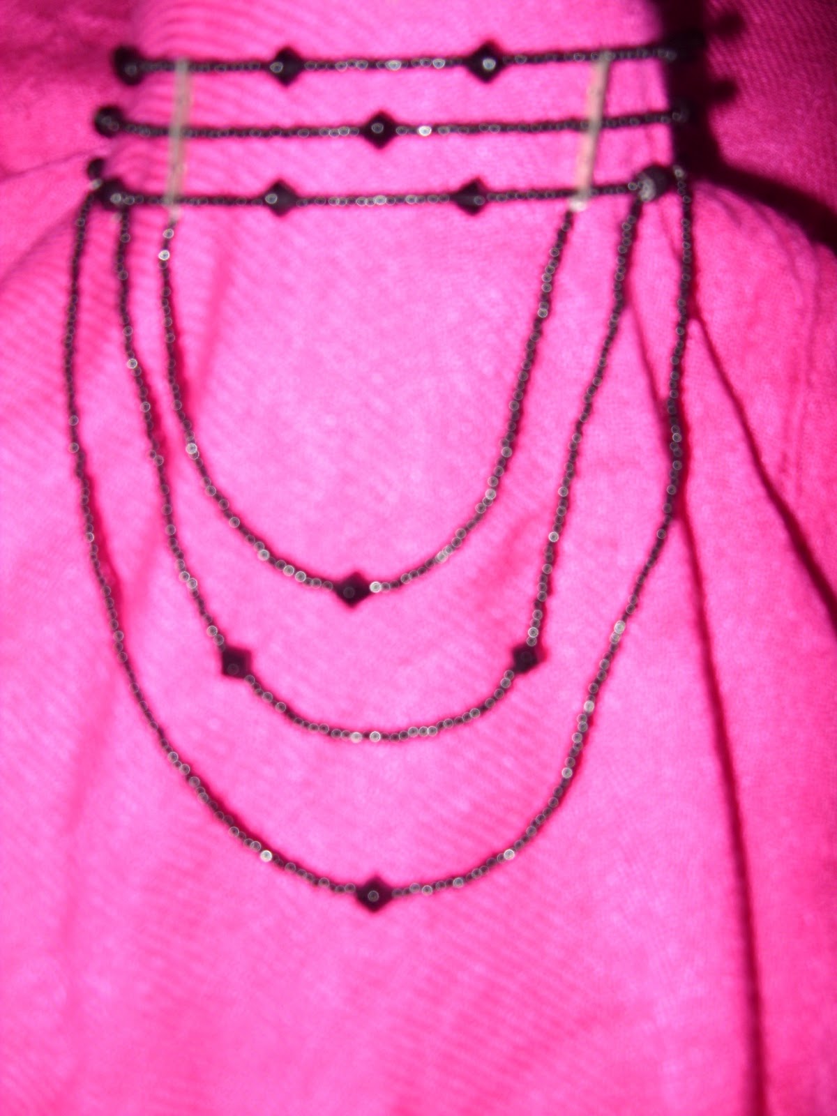 Some of these necklaces resemble the curtain necklaces, but they have more romantic designs. Like the curtain necklaces you can make the neck with memory wire filled with small beads. By using fishing line you can create different patterns with beads in any colour.